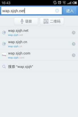 ◇ 在手機上訪問 UC 瀏覽器(或其它支持 wap 網(wǎng)站的瀏覽器),在地址欄中輸入掌上財富客戶端的下載地址:http://wap.sjqh.net ,點擊進入。